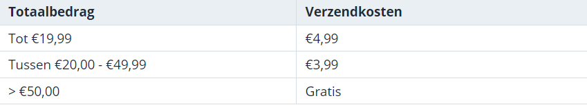 De kosten voor de verzending zijn afhankelijk van het totale aankoopbedrag van de bestelling: